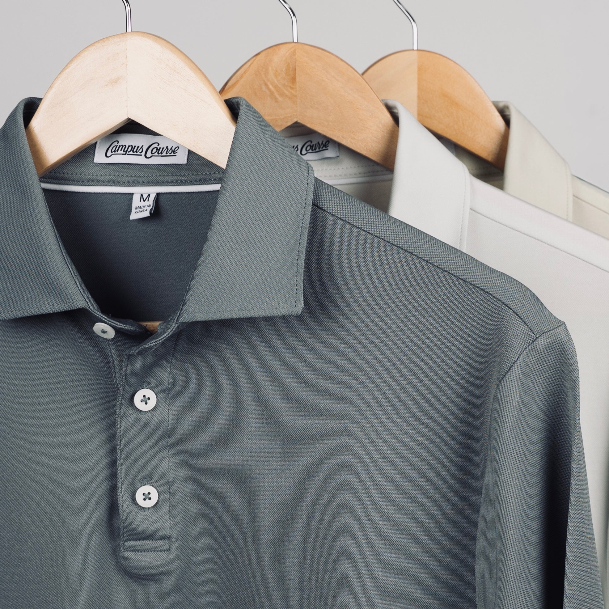 Neutral elegance meets performance fabric. Charcoal, Stone, or Sand with optional school logos. The Sunday Polo is the three-button performance polo that goes everywhere you do.