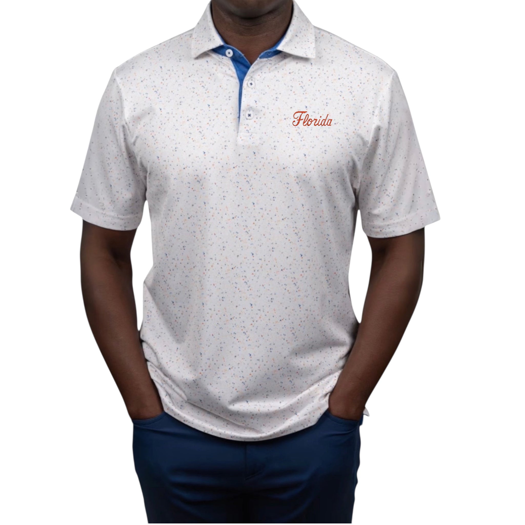 Performance pique polo in white with Florida’s official color speckle detailing, custom embroidered to your specifications.